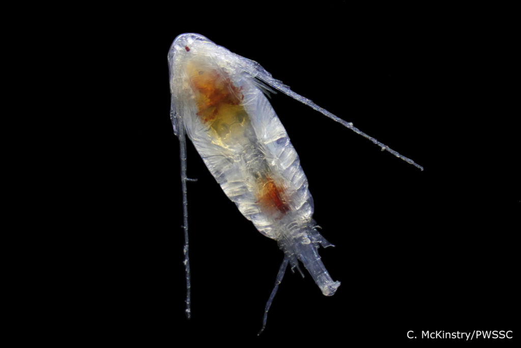 Caitlin counts and identifies zooplankton like this pseudocalanus under the microscope in the lab at the Science Center to get an idea of the abundance of these species.